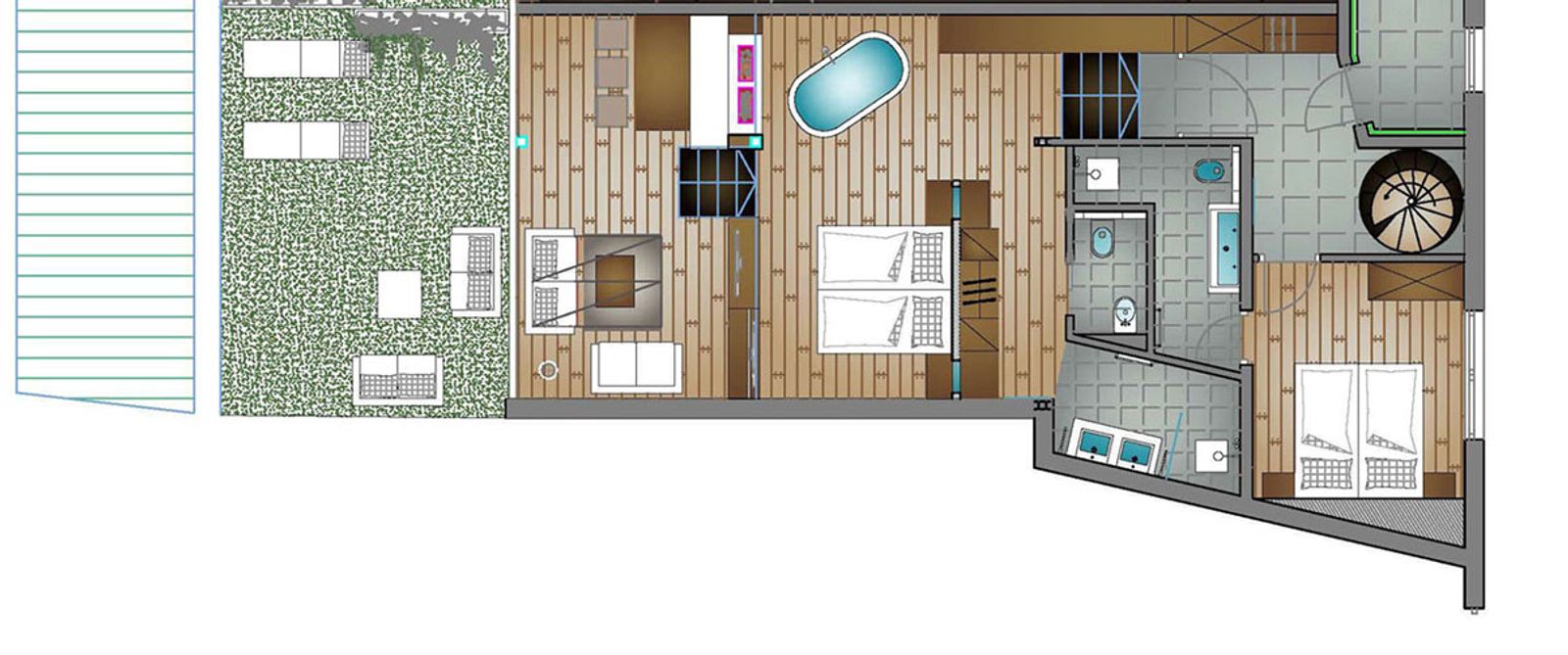approx. 230 m² of which approx. 95 m² make up the living and sleeping area with 2 bedrooms with one bathroom each (one very luxurious) and living room with espresso machine and air-conditioning, approx. 135 m² make up the panorama terrace with own heated infinity pool, outdoor whirlpool and outdoor finnish sauna.