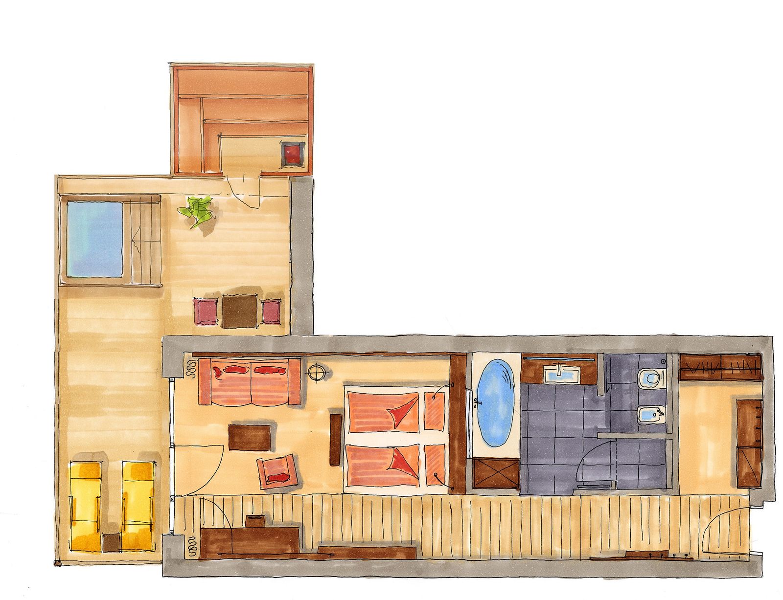 ca. 85m² including 35m² balcony and terrace with Whirlpool and sauna, open bathroom with view of room, bath tub, shower, cosy bed with scenic view, starry sky, Espresso machine. NEW 2025 - with air conditioning