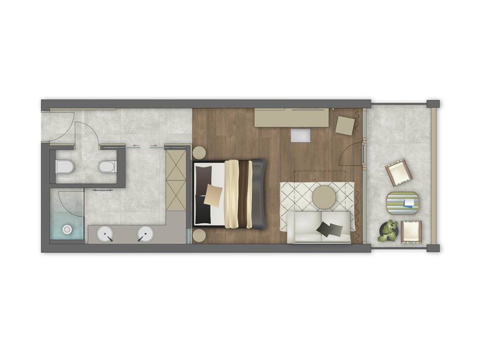 including 8 m² loggia, suite with open bathroom and view into room, cosy bed with views of the countryside.