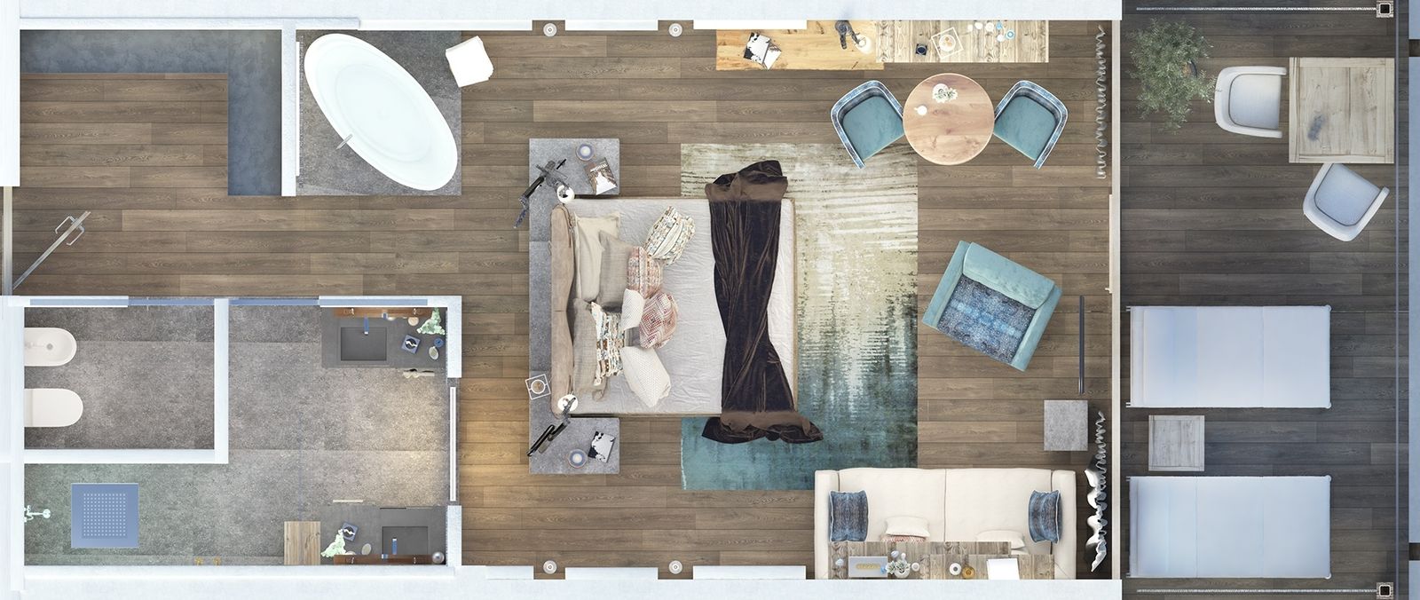 approx. 60m² incl. 10m² loggia facing south with a view of the splendid lake and garden. Cosy bed with a view of the surrounding nature through the large panoramic window, air-condition, freestanding bathtub or infrared cabin for two, luxurious bathroom with partner shower and double washbasin with a view of the room.